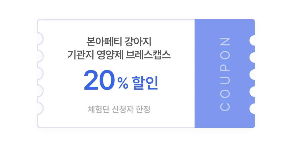 체험단에 신청해주신 분들께 ‘본아페티 강아지 기관지영양제 브레스캡스 60정’을 저렴하게 만나보실 수 있도록, 20%할인 쿠폰을 발급해드렸어요!