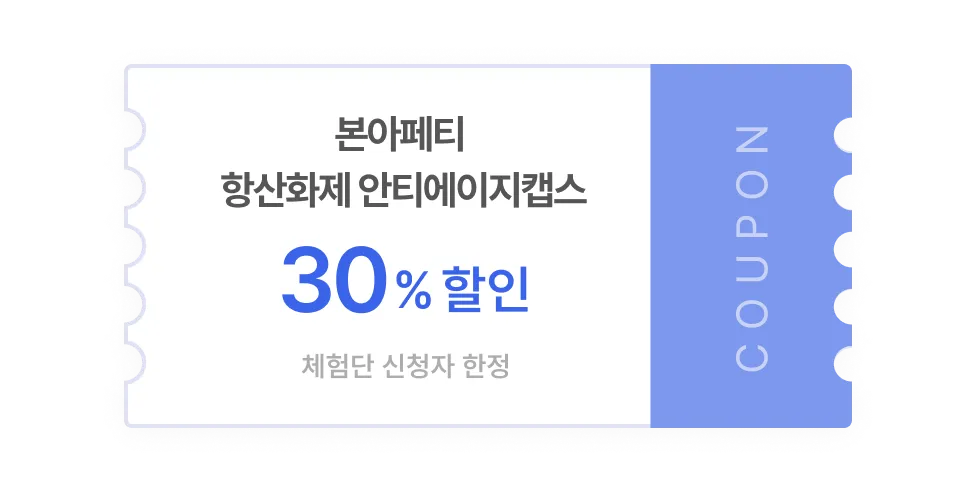 체험단에 신청해주신 분들께 ‘본아페티 항산화제 안티에이지캡스(60정)’를 저렴하게 만나보실 수 있도록, 30%할인 쿠폰을 발급해드렸어요!