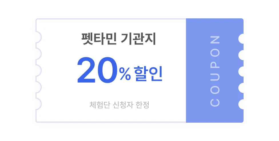 체험단에 신청해주신 분들께 ‘펫타민 기관지케어’를 저렴하게 만나보실 수 있도록, 20% 할인 쿠폰을 발급해드렸어요!