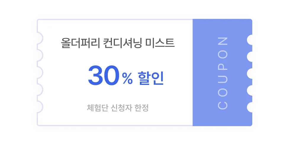 체험단에 신청해주신 분들께 ‘올더퍼리 컨디셔닝 미스트(150ml)’를 저렴하게 만나보실 수 있도록, 30%할인 쿠폰을 발급해드렸어요!
