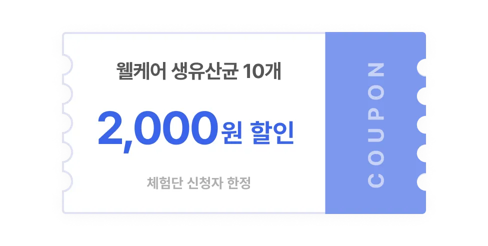 체험단에 신청해주신 분들께 ‘웰케어 유산균’을 저렴하게 만나보실 수 있도록, 2,000원 할인 쿠폰을 발급해드렸어요!