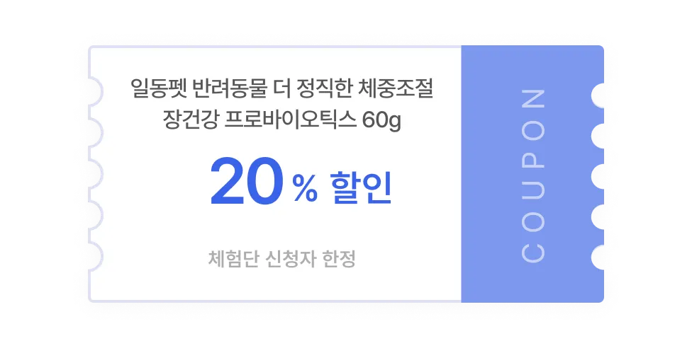 체험단에 신청해주신 분들께 ‘일동펫 더 정직한 체중조절 장건강 프로바이오틱스 60g’을 저렴하게 만나보실 수 있도록, 20%할인 쿠폰을 발급해드렸어요!