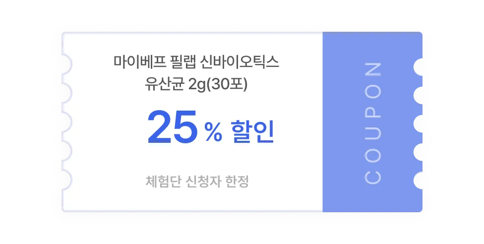 체험단에 신청해주신 분들께 ‘마이베프 필랩 신바이오틱스 강아지 고양이 50억 보장 유산균 2g(30포)’를 저렴하게 만나보실 수 있도록, 25%할인 쿠폰을 발급해드렸어요!