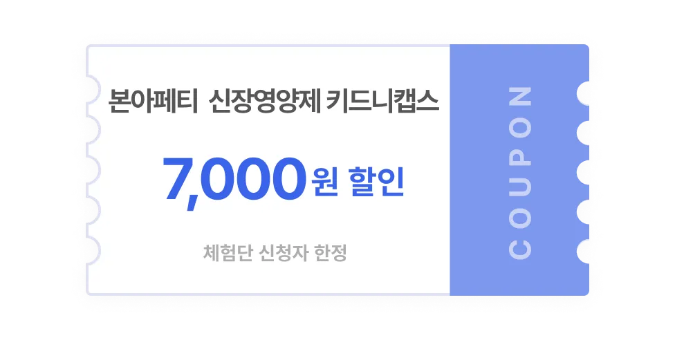 체험단에 신청해주신 분들께 ‘본아페티 신장 영양제 키드니캡스’을 저렴하게 만나보실 수 있도록, 7,000원 할인 쿠폰을 발급해드렸어요!