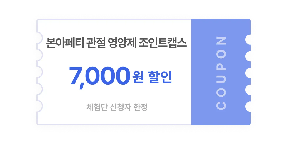 체험단에 신청해주신 분들께 ‘본아페티 관절 영양제 조인트캡스’을 저렴하게 만나보실 수 있도록, 7,000원 할인 쿠폰을 발급해드렸어요!