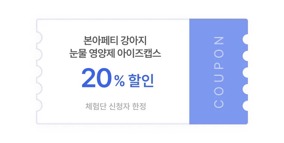 체험단에 신청해주신 분들께 ‘본아페티 강아지 눈물영양제 아이즈캡스 60정’을 저렴하게 만나보실 수 있도록, 20%할인 쿠폰을 발급해드렸어요!
