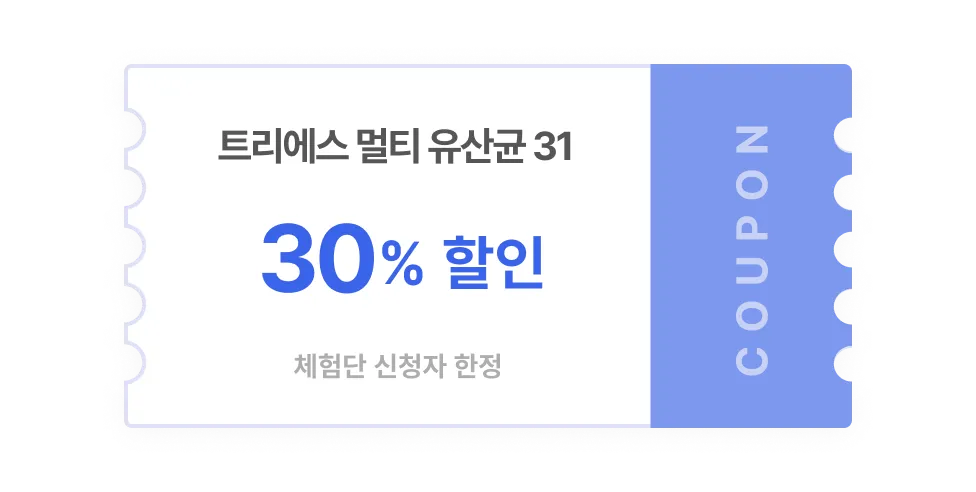 체험단에 신청해주신 분들께 ‘트리에스 최다균종31 멀티 유산균’을 저렴하게 만나보실 수 있도록, 30% 할인 쿠폰을 발급해드렸어요!
