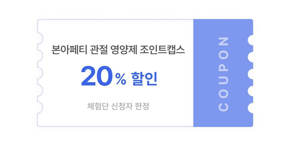 체험단에 신청해주신 분들께 ‘본아페티 강아지 관절영양제 조인트캡스’을 저렴하게 만나보실 수 있도록, 20%할인 쿠폰을 발급해드렸어요!